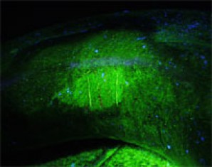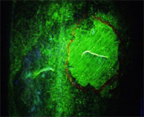 Beispiele einer Farbeindringprüfung mit fluoreszierendem Eindringmittel. Der hier linear erscheinende Fehler wird unter UV-A Licht in abgedunkelter Umgebung sichtbar gemacht.